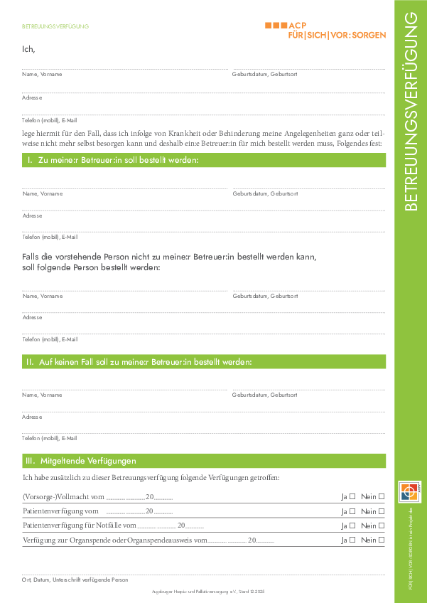 In einer (Vorsorge-)Vollmacht bevollmächtigen Sie mindestens eine Vertrauensperson, an Ihrer Stelle zu entscheiden und zu handeln, wenn Sie selbst dazu nicht in der Lage sind.